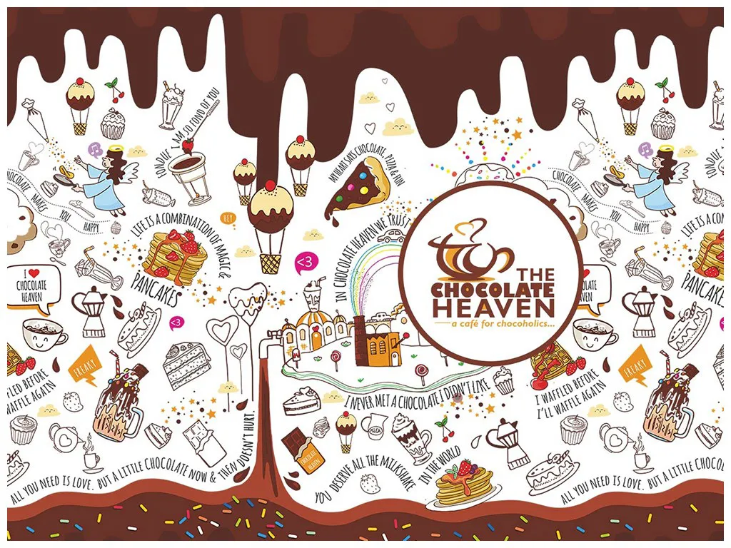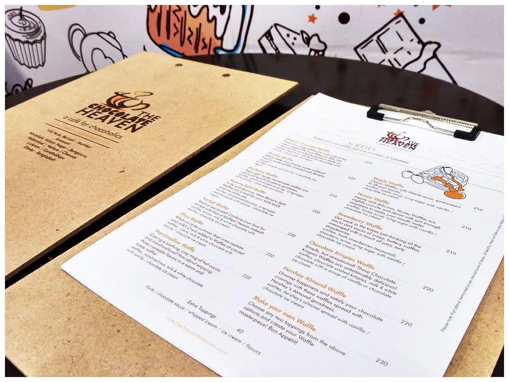 A menu card with chocolate-inspired design elements was created for use in the parlours. The design enabled The Chocolate Heaven to replicate the menu for different outlets easily and in a cost-effective manner.